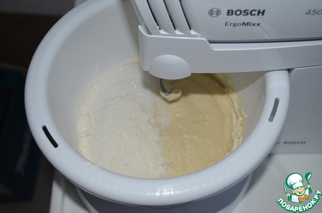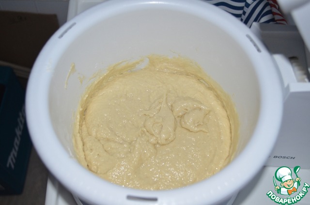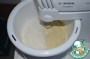 Добавим оставшийся сахар (50 гр), оставшуюся муку (около 40 гр), перемешиваем