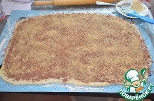 Затем раскатываем в прямоугольник. Пузыри в тесте можно хлопать рукой! Смажем размягченным сливочным маслом, посыпаем сахаром и корицей. Корицы в синнабонах много быть не может