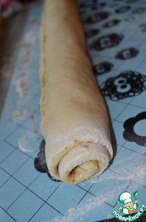 Скатаем в рулет, защипнем край. В этот раз у меня вышло довольно туго, но хорошо поймать золотую середину, когда рулет достаточно упругий для резки и при этом несколько рыхлый, чтобы крему в готовом синнабоне можно было потечь внутрь завитков.