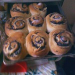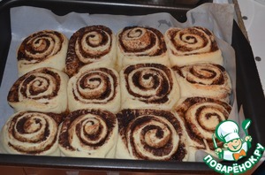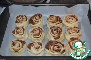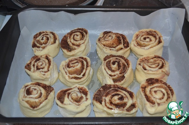 Разрежем очень острым ножом на 12 частей и поместим на противень. Внимание: здесь вы должны поймать оптимальное расстояние между роллами. Оно не должно быть слишком маленьким, чтоб синнабонам было, куда расти, но не должно быть черезчур большим. Готовые синнабоны должны касаться гранями друг друга, тогда изумительная мягкость, присущая оригинальным синнабон, получится и у вас как в центре роллов, так и у наружних завитков. Если же они не будут касаться друг друга, наружные завитки получатся хрустящими. Это тоже вкусно, но если вы стремитесь сделать синнабон "как настоящие", не берите слишком большую форму.