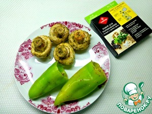Натереть горчичной смесью грибы сверху, а болгарский перец изнутри.