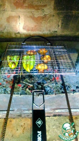 Запечь овощи на решетке над углями в течение 10 минут.