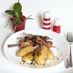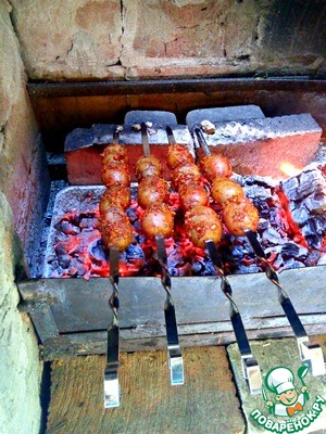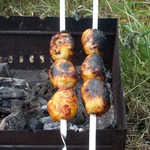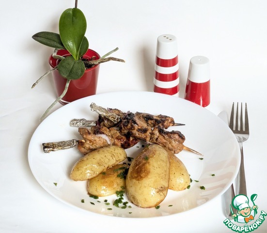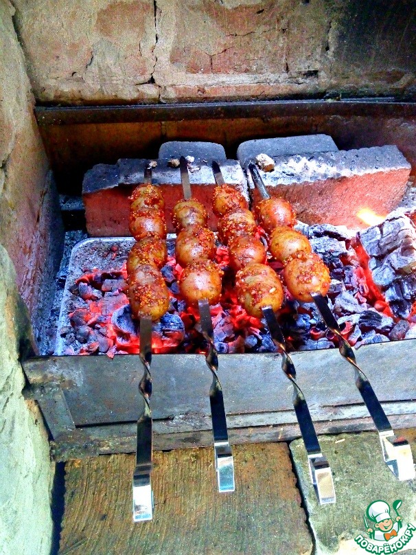 Насадить картофель на шампуры "Forester" и запекать над углями 15-20 минут.
