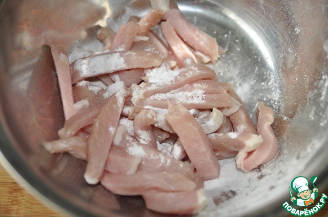 Подмороженную свинину (карбонат) режем тонкими полосками, посыпаем крахмалом, перемешиваем.