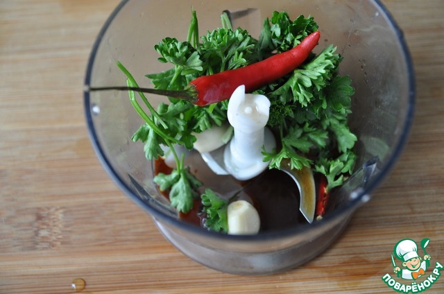 В чаше блендера смешиваем оливковое масло, перец чили (халапеньо), чеснок, кинзу, мёд, сок лайма.