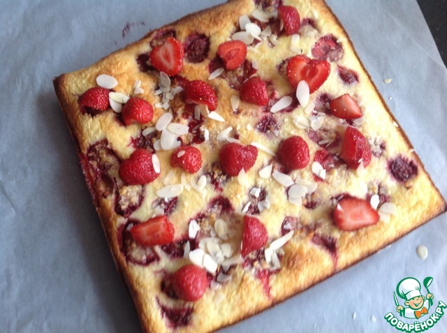 Остудите. Посыпьте миндальными лепестками и украсьте свежей клубникой.