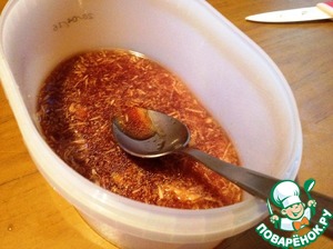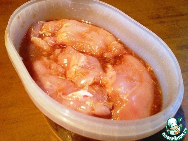 • Куриное филе поперчить, залить маринадом и оставить на 15 минут.