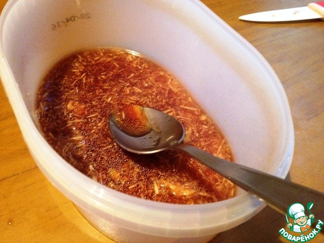 • Соединить соевый соус, кунжутное масло, мёд, винный уксус, имбирь и чеснок.