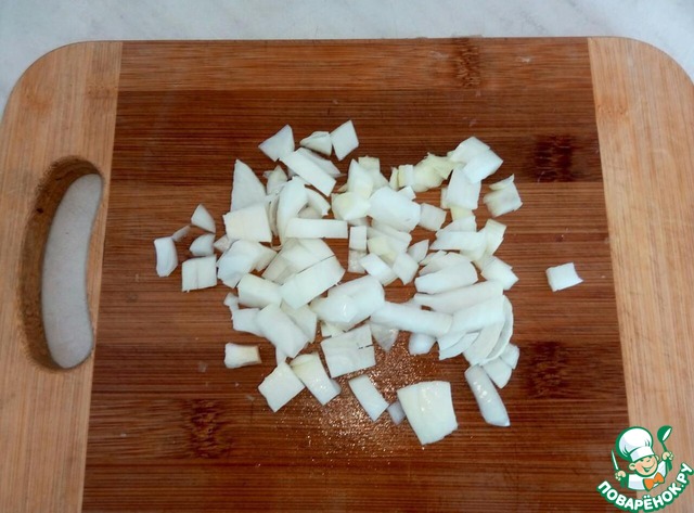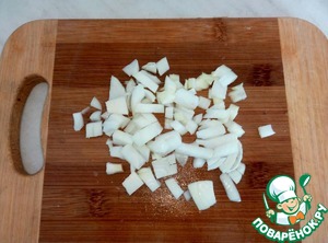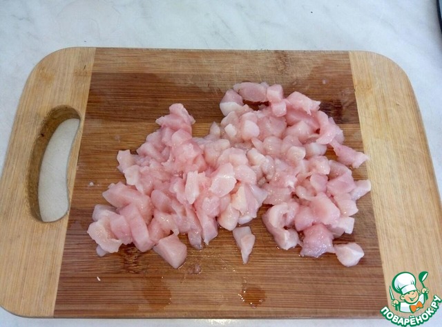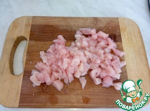 В это время нарезаем куриное филе на кубики. Бросаем его на разогретую сковороду.