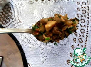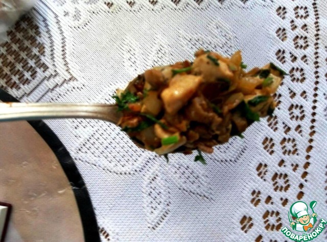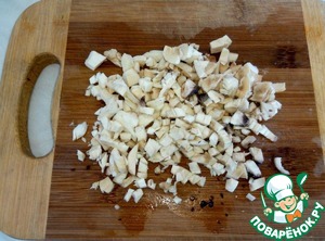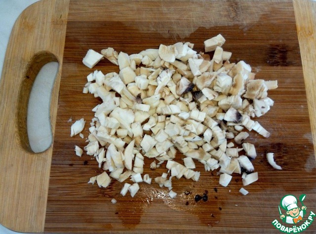 Режем ножки шампиньонов и тоже добавляем в сковороду.