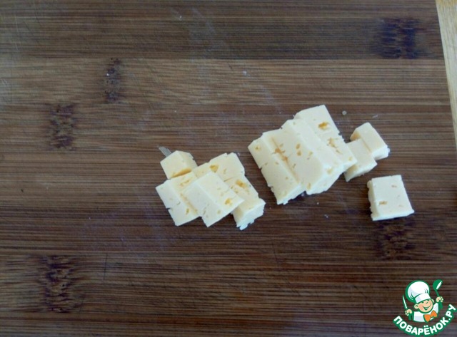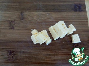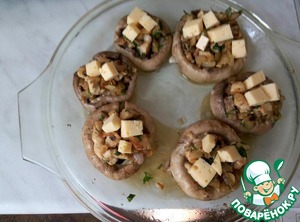 Кладём в каждый грибочек приготовленную начинку и сверху пару кубиков сыра.