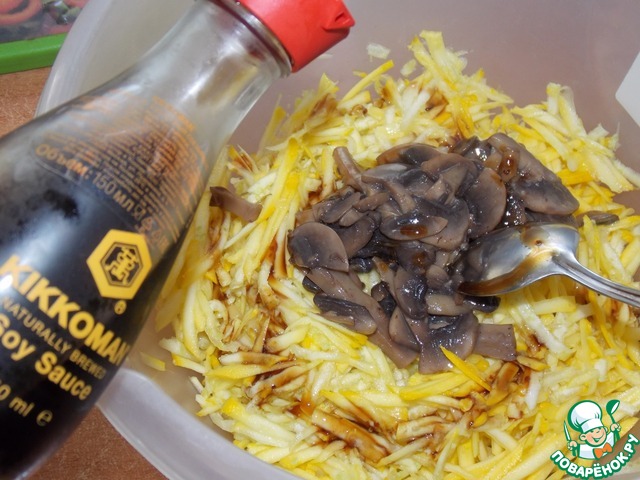 Добавить к кабачку соевый соус и грибы. |