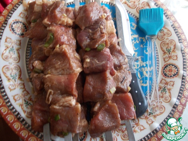 Когда угли почти готовы, нужно нанизать мясо на шампуры и приготовить кисточку, чтобы смазывать мясо во время запекания.