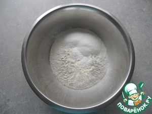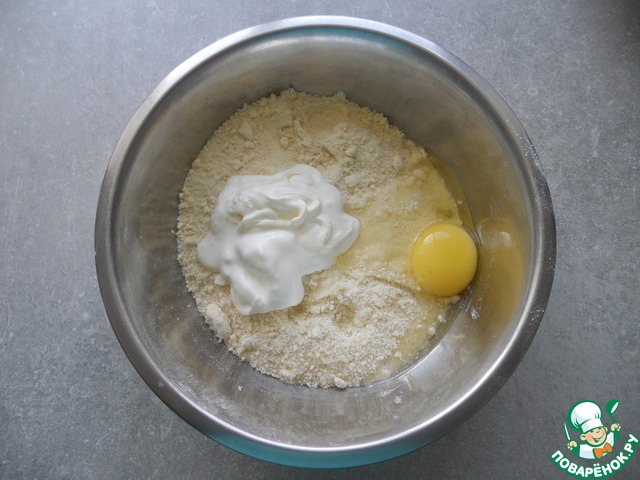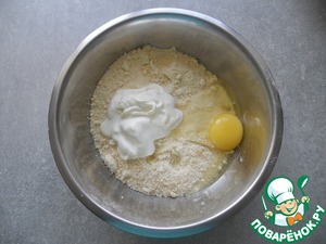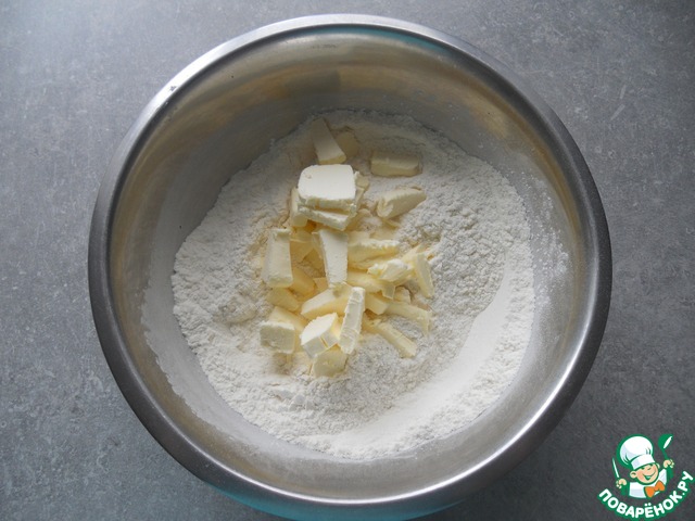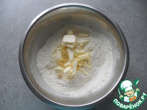 В мучную смесь добавляем холодное сливочное масло и перетираем, чтобы получилась рыхлая крошка.
