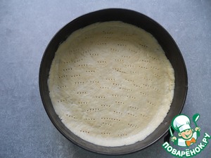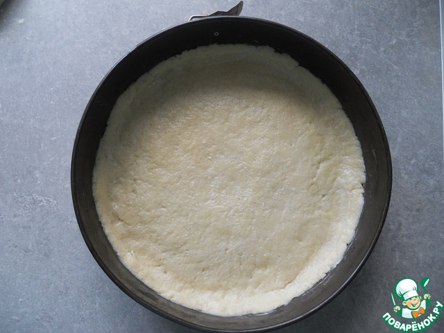 Готовое тесто выкладываем в форму для выпечки, пальцами разглаживаем пласт теста, формирую бортики высотой 1,5 см. Убираем форму с тестом в холодильник на 30 минут