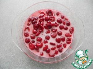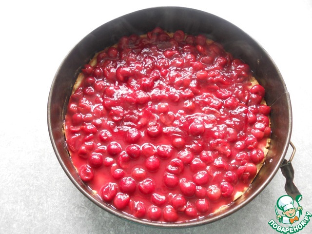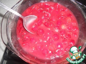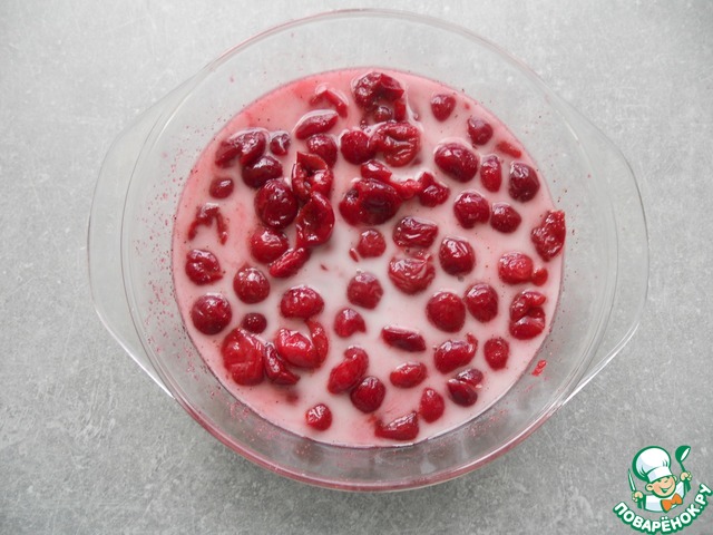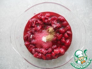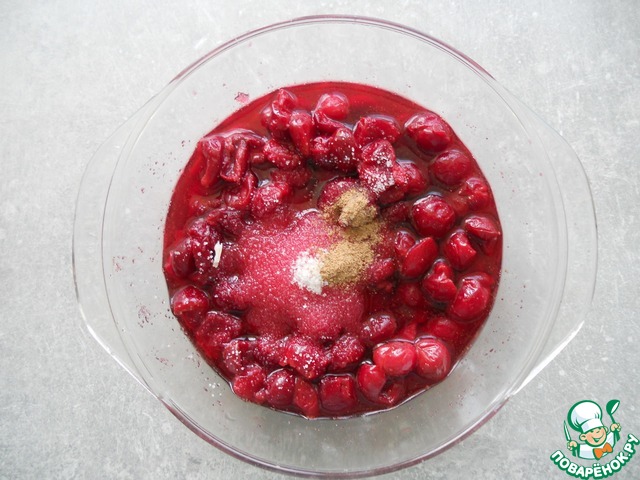 Пока тесто печется, займемся начинкой. Из вишни удаляем косточки. Смешиваем её с сахаром и корицей.