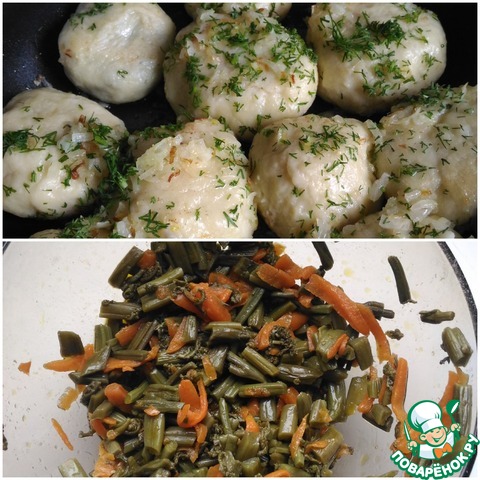 Достать галушки из воды. Я выкладываю их в сковороду на разогретое сливочное масло. Сверху обильненько покрываю их жареным луком ( чем больше - тем вкуснее) и посыпаю укропчиком. Подавать со сметанкой)