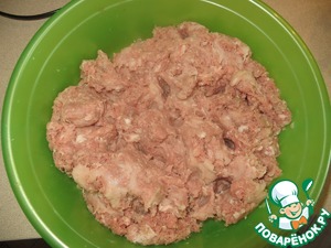 • Перемешать три вида фарша (говяжий, свиной, куриный)
