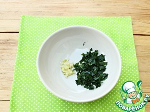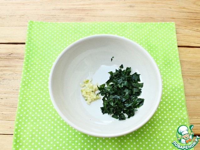 • Очищенный чеснок пропустим через пресс. Листья петрушки (стебли не используем) мелко нарежем и соединим с чесноком.