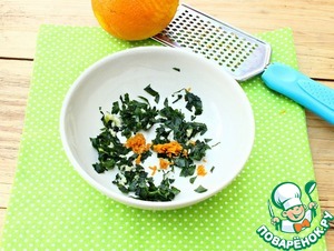 • Апельсин помоем, обсушим. Снимем 0,5 ч. л. цедры и добавим к петрушке с чесноком.