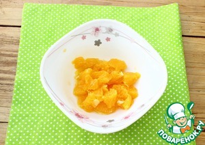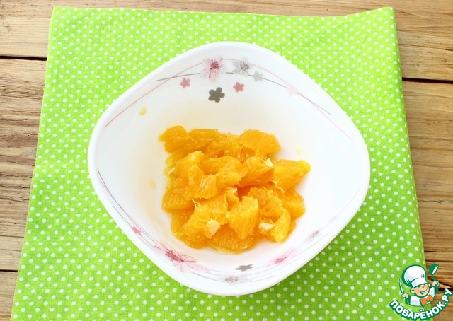 • Апельсины очистим от кожуры. Дольки положим на тарелку и снимем с них пленки. Нарежем очищенные дольки на средние кусочки. Сок, который после процесса очищения от пленок останется на тарелке, мы добавим в заправку.