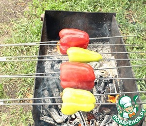 • Перцы вымоем, хорошо обсушим и наденем на двойные шампуры. Обугливаем перцы со всех сторон над пламенем. Очень удобно нанизывать и запекать овощи целиком на двойных шампурах Forester, благодаря V-образной конструкции.