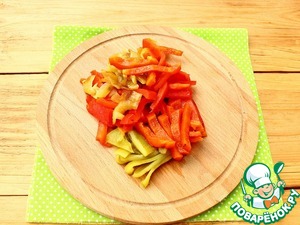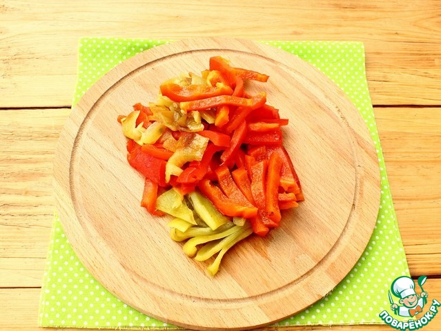 • Перцы вынем из пакета и очистим от кожицы и семян. Нарежем мякоть полосками.
