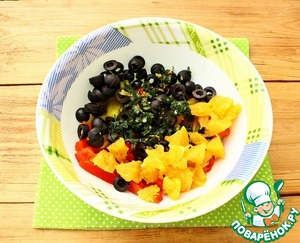 • В чашке смешаем полоски перца, чеснок с петрушкой и цедрой. Добавим кусочки апельсина.