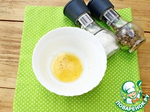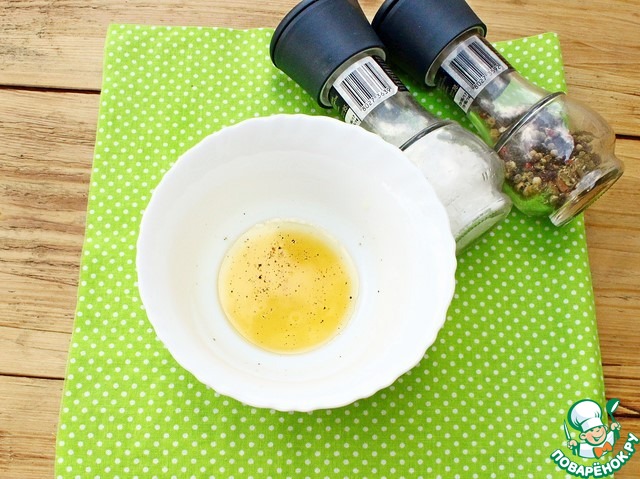 • Сделаем заправку. Соединим оливковое масло с соком апельсина. Добавим соль и перец по вкусу. Заправим закуску и подадим на стол.