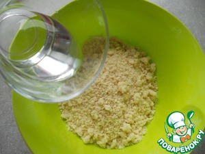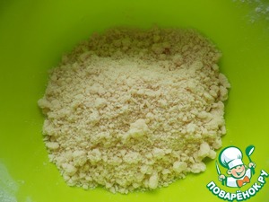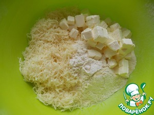 Сыр натереть на мелкой терке. Холодное масло нарезать на кубики. Добавить к муке.