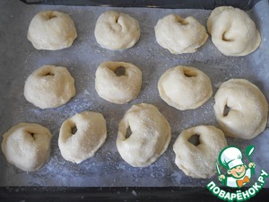 Выкладываем на противень, застеленный пергаментом или ковриком для выпечки, обмазать молоком и на каждый пирожок посыпать сахар.