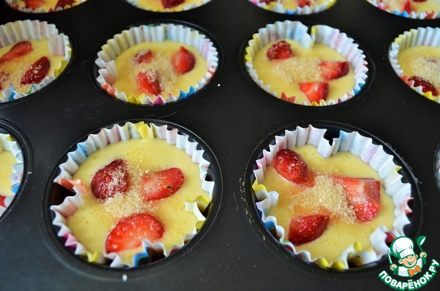 Вылить по 1,5 ч. л. теста в формочки для кексов, выложить в каждую по 3-4 кусочка клубники.