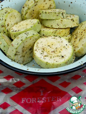 Кабачок порезать кольцами примерно 1.5 см. толщиной. Смазать растительным маслом и посыпать специями, дать постоять 10 мин.