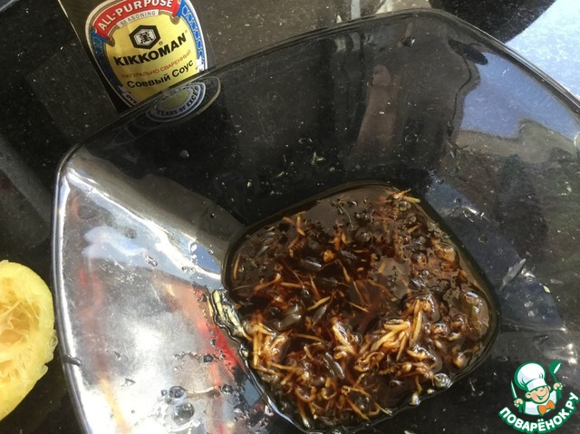 В миске смешайте имбирь, соевый соус, сок лимона.