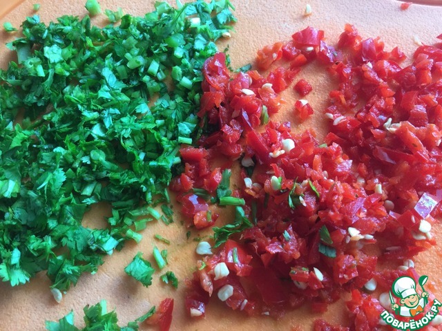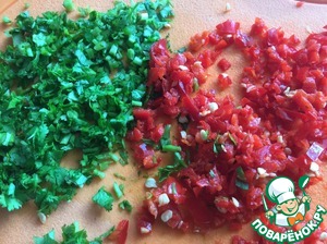 Кинзу и перец мелко порубите.