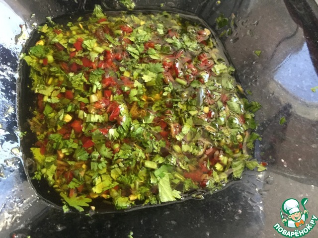 Кинзу, перец и оливковое масло добавьте в миску, перемешайте и оставьте настоятся.