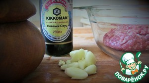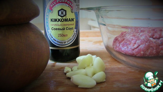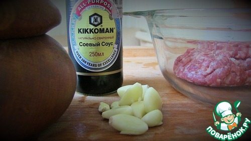 Добавить в фарш соевый соус 4 ст. л., чеснок, соль.