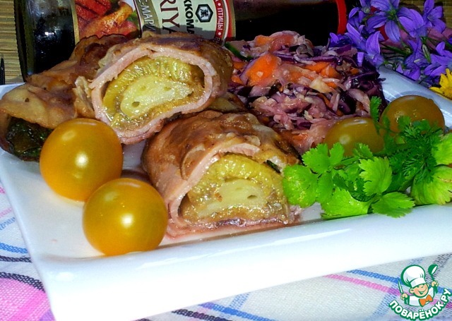 Рулетики из кабачка и ветчины с сыром в панировке.