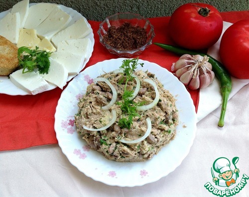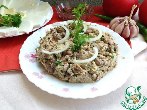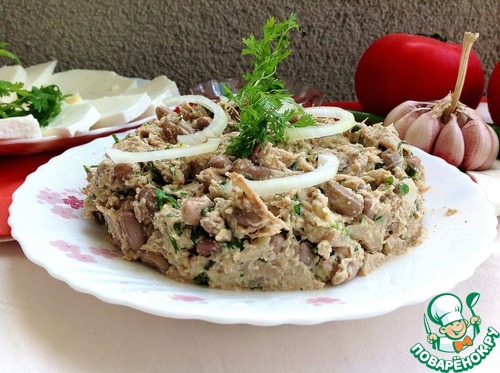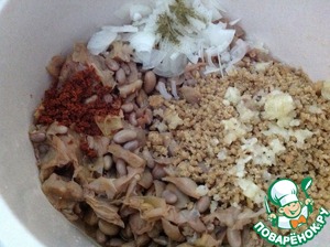 К остывшей фасоли добавить орехи, соль, специи, чабер.