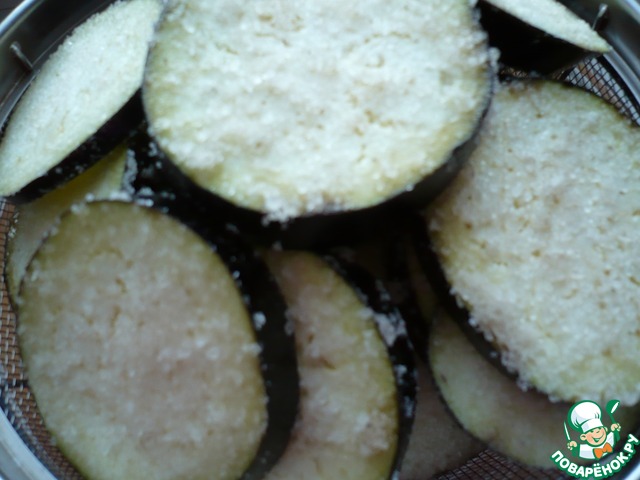 Для приготовления закуски я взяла два средних баклажана. Нарежьте баклажаны кружками толщиной около 0,5 сантиметра, выложите в сито и как следует посолите. После этого переверните и снова посолите – пересолить не бойтесь. Дайте полежать минут 10, затем хорошо промойте баклажаны под холодной водой и обсушите.