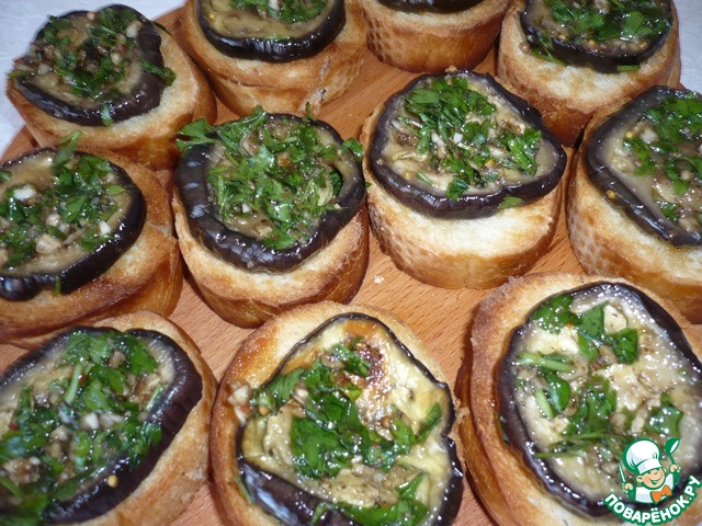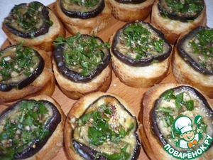 На каждый ломтик багета выкладываем кружок замаринованного баклажана.