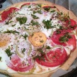 Вынимаем пиццу из духовки и выкладываем на нее начинку - смазываем соусом, выкладываем болгарский перец, курицу, порезанные помидоры и сверху разбиваем яйца, перчим и солим по вкусу.