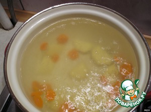 Воду на огонь. Практически сразу можно бросить морковные кружочки. Ждём кипения.