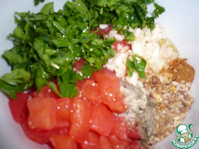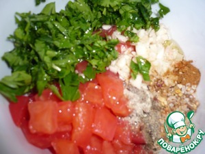 Добавьте в нарезанные помидоры: измельченный чеснок, а также зелень базилика и петрушки, соедините все это с оливковым маслом и лимонным соком, добавьте соль, смесь перцев и приправу для овощей и грибов "Forester". Хорошо все размешайте.
