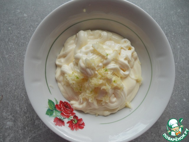 Самый верхний слой смазать майонезом, украсить тертым яйцом и зеленью.
