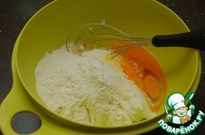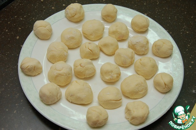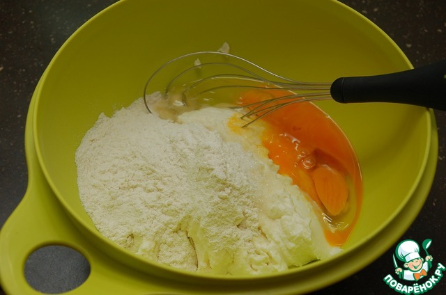 Месите до тех пор, пока тесто не начнет собираться в шар. Тут я допустила ошибку. Положила сразу два яйца. И мне понадобилось почти в 2 раза больше муки (220 гр.). У меня ещё мука такая неудачная попалась (всегда нужно больше, чем в рецепте). Возможно, ещё творог влажноват был. Можно предварительно дать ему стечь.