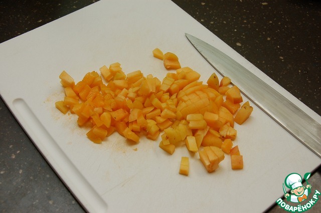 Из абрикосов удалите косточки и нарежьте мякоть мелкими кубиками.