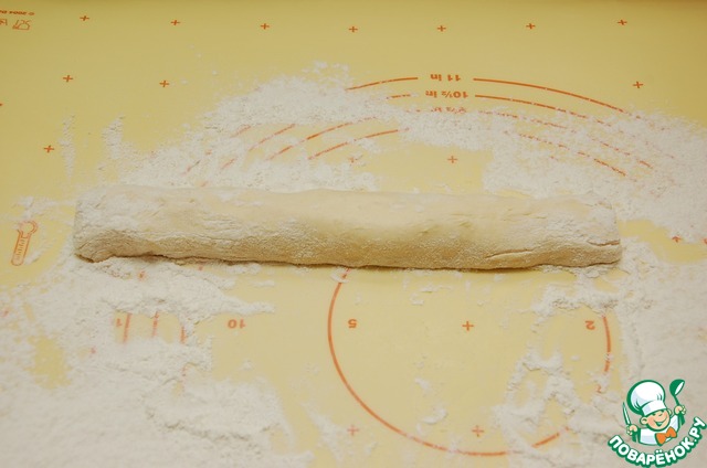 Добавьте абрикосы в творожную массу и хорошо перемешайте. Разделите массу на 4 части и на присыпанной мукой поверхности раскатайте каждую в жгут диаметром 1,5-2 см.