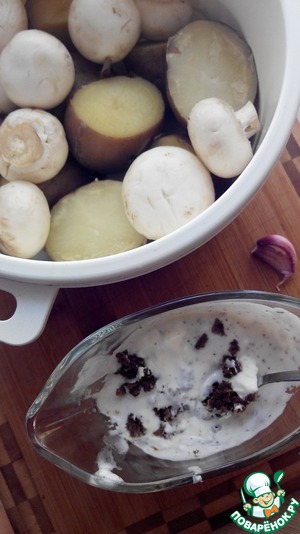 Картофель нарезать пополам или на 3 части в зависимости от размера. Добавить шампиньоны. Смешать йогурт, измельчённый чеснок, аджику. Смешать овощи с соусом. Оставить часа на 1,5-2