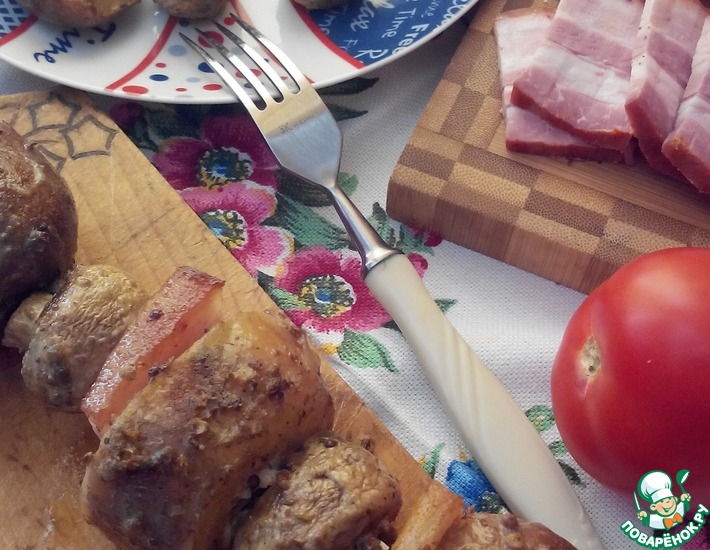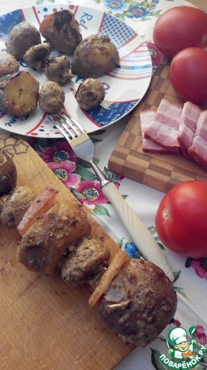 Грудинку нарезать кусочками толщиной 0,5 см. На шампуры нанизать поочередно шампиньоны, картофель, грудинку.
